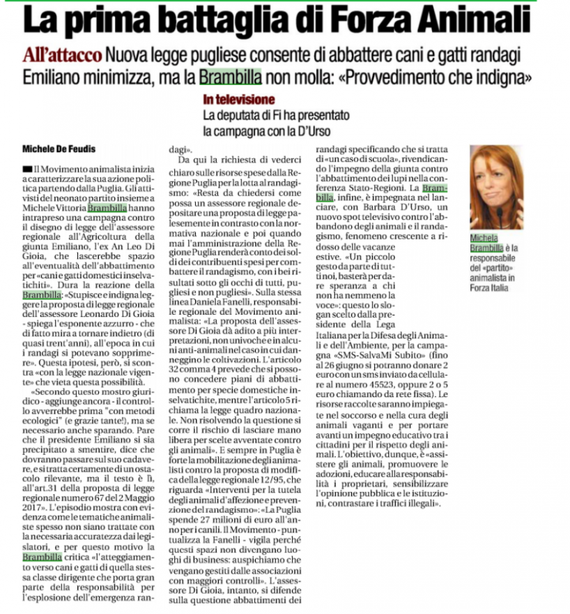 IL TEMPO. IL MOVIMENTO ANIMALISTA CONTRO L’IPOTESI ABBATTIMENTI DI CANI E GATTI IN PUGLIA 5 Giugno 2017 GIORNATA MONDIALE DELL’AMBIENTE, ON. BRAMBILLA: “NO ALLA LIBERTA’ DI INQUINARE E A QUELLA DI SPARARE” MOVIMENTO ANIMALISTA, SONDAGGIO “LIBERO”: PIACE E CONQUISTA VOTI, 35% LA FIDUCIA